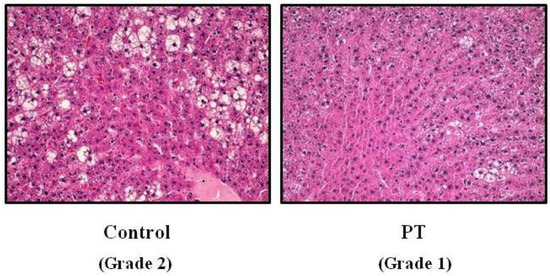 Pterostilbene significantly reduced adipose tissue mass (p = 0.04). Interestingly, a lower liver weight was observed in rats treated with pterostilbene. Although the differences were statistically non-significant (p = 0.092), the effect size was rated as moderate (Cohen’s d = −0.78). Triacylglycerol content was also reduced by pterostilbene (−16.9%). When steatosis was evaluated by microscopy, fat infiltration that reached grade 2 in the control rats was reduced to grade 1 in the pterostilbene-treated group (Figure 1). Moreover, the percentage of samples showing grade 3 steatosis were reduced from 15.5% in the control rats to 3.1% in pterostilbene-treated animals. No differences were observed in food intake between both experimental groups (Table 2).