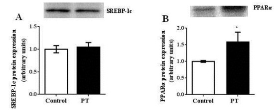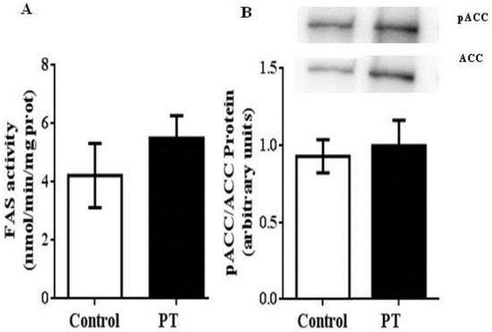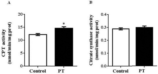 We also measured the activities of two enzymes involved in fatty acid oxidation. In this case, a significant increase was observed in CPT-1a activity in PT group when compared to the control group (p = 0.003) (Figure 3A), whereas no differences were found in CS activity between both experimental groups (Figure 3B).