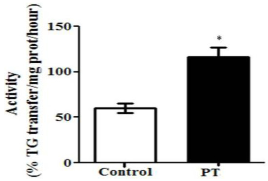 To assess the assembly of very low-density lipoproteins by the liver, microsomal triglyceride transfer protein (MTP) activity was determined fluorimetrically by using a commercial kit (Sigma-Aldrich, St. Louis, MO, USA). MTP activity was expressed as a percentage of triacylglycerol transfer/mg protein/hour [26].
