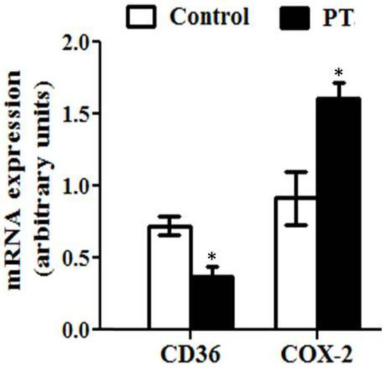 The expression of several genes involved in lipid metabolism was also assessed in the present study. The expression of CD36, a fatty acid transporter, was significantly decreased by pterostilbene (p = 0.01) (Figure 5). Moreover, the mRNA level of cox-2, a mitochondrion-encoded protein located in the inner mitochondrial membrane, was significantly increased in rats from the PT group (p = 0.01) (Figure 5).