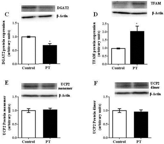 Pterostilbene administration did not modify protein expression of SREBP-1c, the transcription factor that regulates the expression of lipogenic enzymes (ACC and FAS) (Figure 6A). In contrast, protein expression of PPARα, which plays a key role in the transcription of genes involved in fatty acid oxidation, was up-regulated by pterostilbene treatment (p = 0.04) (Figure 6B). In addition, mtTFA, involved in mitochondria biogenesis, was also significantly increased in the PT group when compared to the control group (p = 0.01) (Figure 6C). Finally, protein expression of DGAT2, an enzyme with a crucial role in the assembly of triacylglycerols, was significantly decreased in the PT group (p = 0.02) (Figure 6D) when compared to the control group, while the UCP2 expression remained unchanged, in both monomeric and dimeric forms (Figure 6E,F).