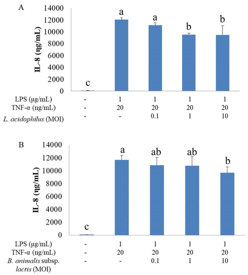 Effects of different doses of single probiotics on IL-8 secretion in inflammatory HT-29 cells. All values except for control are mean ± SD (n = 3). Bars with the same letter are not significantly different from one another determined by Duncan’s multiple range test, p < 0.05. (A) The inhibitory effect of L. acidophilus on IL-8 secretion; (B) the inhibitory effect of B. animalis subsp. lactis on IL-8 secretion.