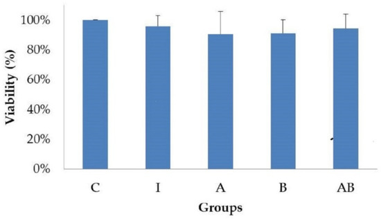 Effects of pro-inflammatory factors and probiotics on viability of HT-29 cells. All values except for control are mean ± SD (n = 3). There is no significant difference among groups determined by Duncan’s multiple range test, p < 0.05. C, control; I, TNF-α (20 ng/mL) with LPS (1 μg/mL); A, L. acidophilus at MOI of 1 with TNF-α (20 ng/mL) and LPS (1 μg/mL); B, B. animalis subsp. lactis at MOI of 10 with TNF-α (20 ng/mL) and LPS (1 μg/mL); AB, L. acidophilus at MOI of 1 and B. animalis subsp. lactis at MOI of 10 with TNF-α (20 ng/mL) and LPS (1 μg/mL). Control group is used as the reference.
