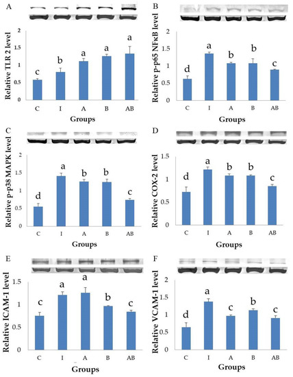 Effects of probiotics on the expression of inflammation-related proteins in inflammatory HT-29 cells. All values are mean ± SD (n = 3). Bars with the same letter are not significantly different from one another determined by Duncan’s multiple range test, p < 0.05. C, control; I, TNF-α (20 ng/mL) with LPS (1 μg/mL); A, L. acidophilus at MOI of 1 with TNF-α (20 ng/mL) and LPS (1 μg/mL); B, B. animalis subsp. lactis at MOI of 10 with TNF-α (20 ng/mL) and LPS (1 μg/mL); AB, L. acidophilus at MOI of 1 and B. animalis subsp. lactis at MOI of 10 with TNF-α (20 ng/mL) and LPS (1 μg/mL). (A), expression of toll-like receptor 2 (TLR2); (B), expression of phosphorylated p65 nuclear factor kappa B (p-p65 NFκB); (C), expression of phosphorylated p38 mitogen-activated protein kinase (p-p38 MAPK); (D), expression of cyclooxygenase-2 (COX-2); (E), expression of intercellular adhesion molecule-1 (ICAM-1); (F), expression of vascular cell adhesion molecule-1 (VCAM-1).