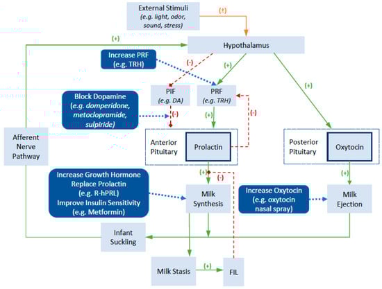 Given the important roles of prolactin and oxytocin in regulating milk secretion and milk ejection, these hormones have become common pharmacological targets for influencing breast milk supply. Figure 1 provides an overview of endogenous and exogenous factors influencing prolactin and oxytocin, while also highlighting mechanisms of action of common pharmaceutical galactagogues. A more detailed review of the neuroendocrine regulation of prolactin and oxytocin secretion and function can be found elsewhere and is beyond the scope of this review [14]. In brief, the production of prolactin in the anterior pituitary is regulated by the presence of prolactin inhibiting factors (PIF) and prolactin releasing factors (PRF), which are controlled by the hypothalamus. The concentrations of these inhibitory and stimulatory factors is influenced by a variety of external stimuli such as infant suckling, sounds of the infant crying, and stress. The key PIF is dopamine, which exerts an inhibitory effect on prolactin production. Positive external stimuli lead to an inhibitory effect on dopamine release and a resultant increase in prolactin levels. Similarly, medications that block dopamine, such as the dopamine antagonists domperidone and metoclopramide, block its inhibitory effects and result in an increase in prolactin secretion. In contrast, a range of hormones act to stimulate prolactin production, including thyrotropin releasing hormone, cortisol, and oxytocin. Other hormones that exert direct or indirect effects on the mammary gland to influence milk synthesis include the growth hormone, prolactin and insulin. Milk contains a small whey protein called the feedback inhibitor of lactation (FIL). The accumulation of milk in the breast leads to milk stasis and an increased concentration of FIL, which provides a negative feedback to slow milk production by inhibiting the action of prolactin on lactocytes.