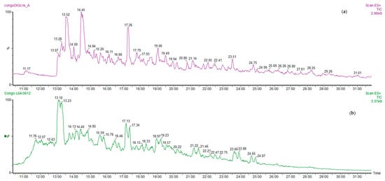 Ultra-high performance liquid chromatography/electrospray ionisation mass spectrometry (UPLC/ESI-MS) chromatogram of a digested sample of Congo fermented cocoa bean (a) compared to the peptide profile of the corresponding not digested, extracted sample (b).