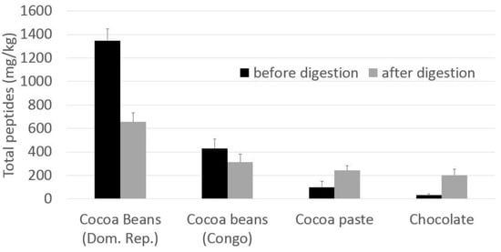 Peptides amount (mg/kg) in digested sample compared to the amount in the respective non-digested samples. Peptides were quantified as ratio of peptides area vs. internal standard area (phe-phe) and referred to the initial cocoa amount, making the raw assumption that the specific response factor for each peptides is equal to 1. The total peptides amount is referred to the sum of peptides listed in Table 1.