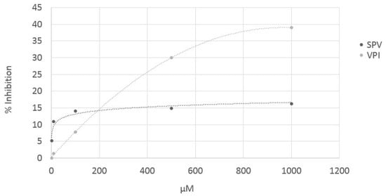 Sigmoid curves obtained by plotting the inhibitory activity of pure peptides SPV and VPI (synthetized by Fmoc protocol) against peptide concentration.