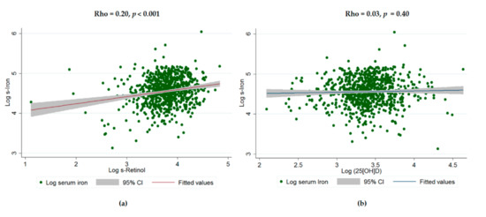 Figure 2 demonstrates the positive correlation between log retinol and serum iron levels (rho = 0.20, p < 0.001) (Figure 2a); while logged 25(OH)D levels were not correlated with log serum iron levels (rho = 0.03, p = 0.40) (Figure 2b).