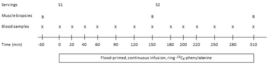 Hereafter, at 8.30 h (time 0 min), subjects were served a protein drink for breakfast (serving 1: 15 g protein) together with 150 mL water. Blood samples were then drawn after 20, 40, 60, 90, 120 and 150 min. After 150 min the second muscle biopsy was taken from vastus lateralis and at 160 min a second protein serving was provided (serving 2: 30 g protein) with 200 mL. of water together with toast bread (see section Protein servings). Blood samples were then drawn at the following times 180, 200, 220, 250, 280 and 310 min. At time 310 min the third muscle biopsy was taken from vastus lateralis and the infusion with [ring-13C6] phenylalanine was stopped. Urine samples were collected from 0–160 min (serving 1) and from 160–310 min (serving 2) to determine postprandial urea excretion.