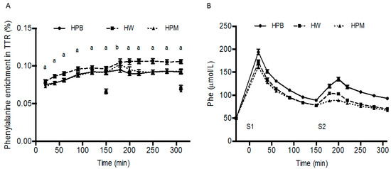 Mean ± SEM tracer enrichments (tracer-to-tracee ratio (TTR)) in plasma (p) (dots with lines) and muscle (dots at 150 and 310 min only) following the flood-primed continuous infusion with [ring-13C6] phenylalanine (A), and p-phenylalanine concentrations after consumption of serving 1 and serving 2 (B), n = 18. (A) a HW significantly different from HPB and HPM, p < 0.05. b HPB significantly different from HPM, p < 0.05. Data on TTR were analyzed using linear mixed-effects models with a time-treatment interaction and treatment order and age as fixed effects and with subject-specific random effects. Data on p-phenylalanine were analyzed as area under the curve (AUC): AUCserving1 and AUCserving2 using a linear mixed-effects model with a serving-treatment interaction and with treatment order and age as fixed effects and with subject-specific random effects. HPB, hydrolyzed porcine blood protein; HPM, hydrolyzed porcine muscle protein; HW, hydrolyzed whey protein.