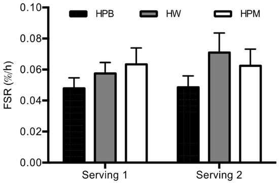 Mean ± SEM 2.5 h FSR after serving 1 and serving 2, n = 18. Differences in FSR between proteins were analyzed using a linear mixed-effects model with a serving-treatment interaction and with treatment order and age as fixed effects and with subject-specific random effects. There was no effect of protein or serving (p ≥ 0.14). FSR, fractional synthesis rate; HPB, hydrolyzed porcine blood protein; HPM, hydrolyzed porcine muscle protein; HW, hydrolyzed whey protein.