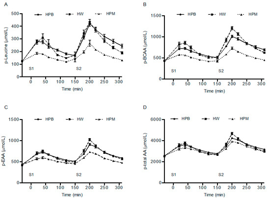 AUC for amino acids were calculated after each of the servings. AUCs after serving 1 were: p-leucine, HPB = HW > HPM; p-BCAA, HW > HPB > HPM; p-EAA, HPB = HW > HPM; p-total amino acids, HPB = HW > HPM. AUCs after serving 2 were: p-leucine HPB ≥ HW > HPM; p-BCAA, HW = HPB > HPM; p-EAA, HPB = HW > HPM; p-total amino acids, HPB = HW > HPM (Figure 4).
