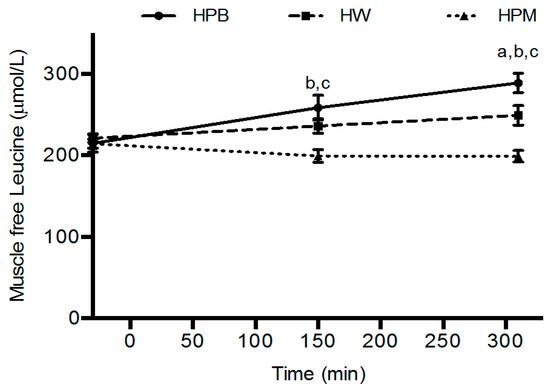 Muscle free leucine concentrations were higher for HPB and HW than HPM (p < 0.01) at 150 min, with no difference between HPB and HW (p = 0.08). At 310 min muscle free leucine concentrations were higher for HPB than HW (p < 0.01) and HPM (p < 0.001), and higher for HW than HPM (p < 0.001) (Figure 5).