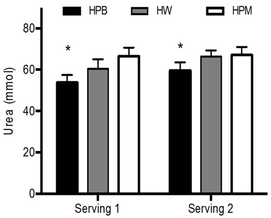 Postprandial urea concentrations were lower for HPB than HPM and HW after serving 1 (p < 0.05) and after serving 2 (p < 0.01) with no significant effect of serving. There was no difference between HW and HPM (p ≥ 0.44) (Figure 6).
