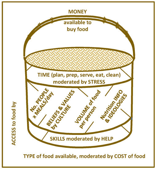 Previous studies [15,16,25] have cited the cost of healthy foods as a major barrier to healthier diets. However, our study shows that the price of healthy foods cannot be looked at in isolation. Cost is relative to the many other factors presented in our model, such as access and preparation time. Further, cost is often researched in a reductionist way, for instance, when it is defined in terms of the affordability of food items relative to other food items, such as healthy versus unhealthy [16]. The amount of time necessary for travelling to a store and shopping for food is often overlooked [15], though one study attempted to account for the additional cost incurred in food preparation time [16]. Our participants identified time as a major barrier to provision of healthy food. Food preparation time was weighed relative to their desire to spend quality time with their children, as well as their general sense of having insufficient time for most things in their daily lives.
