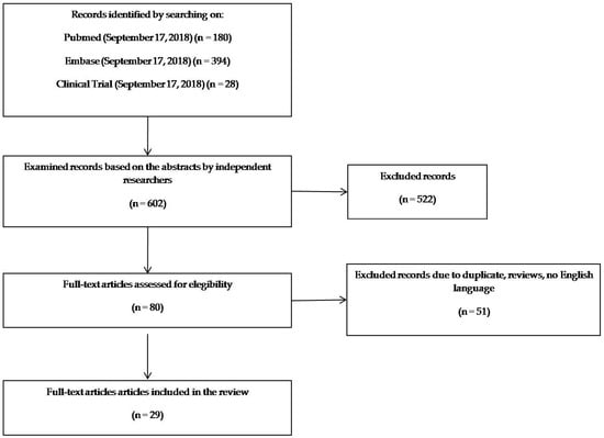 The initial search identified 602 studies, with 522 records excluded following abstract review (Figure 1). Of the 80 articles retrieved, 51 were excluded because of duplicates, reviews, letters, abstracts and articles without full-text in English language. In the end, 29 studies were included in the analysis. Included studies were published between 2008 and 2018.