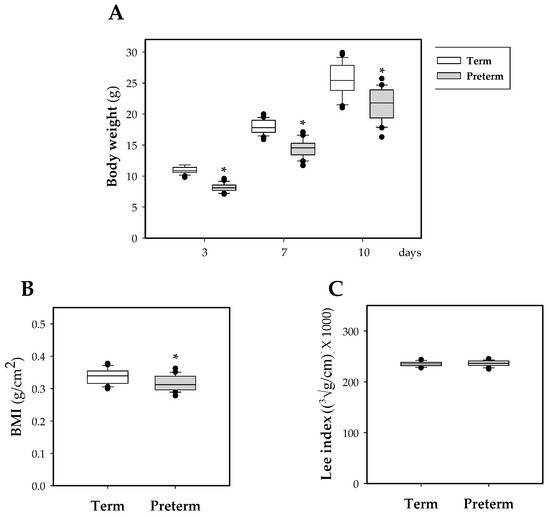 Throughout the study, as expected, the weight of rats that were born in preterm conditions was lower than that of the term pups (p < 0.05, Figure 1A), indicating an important effect of the length of gestation period on body weight. This decrease has an impact on the BMI at day 10 (p < 0.01 vs. term group, Figure 1B). No differences were observed in the Lee index at the same day (Figure 1C).