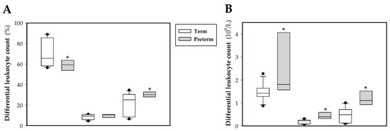 Box plot of differential leukocyte count in percentage (A) and in absolute values (B) at the end of the study (day 10) in both experimental groups. Line indicates the median, box shows the interquartile range (IQR) and the whiskers are 1.5 × IQR (n = 10 pups per group). Statistical differences: * p < 0.05 vs. term group.