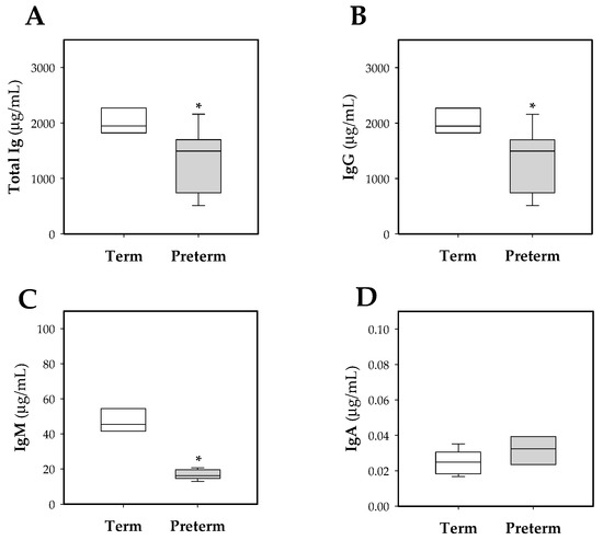 Box plot of plasmatic Ig concentrations at day 10 of life in both experimental groups. Total Ig (A), IgG (B), IgM (C), IgA (D). Line indicates the median, box shows the interquartile range (IQR) and the whiskers are 1.5 × IQR (n = 10 pups per group). Statistical differences: * p < 0.05 vs. term group.