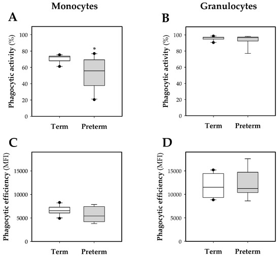 Box plot of phagocytic function of blood leukocytes. Phagocytic activity and efficiency in monocytes (A,C) and granulocytes (B,D). Line indicates the median, box shows the interquartile range (IQR) and the whiskers are 1.5 × IQR (n = 10 pups per group). Statistical differences: * p < 0.05 vs. term group.
