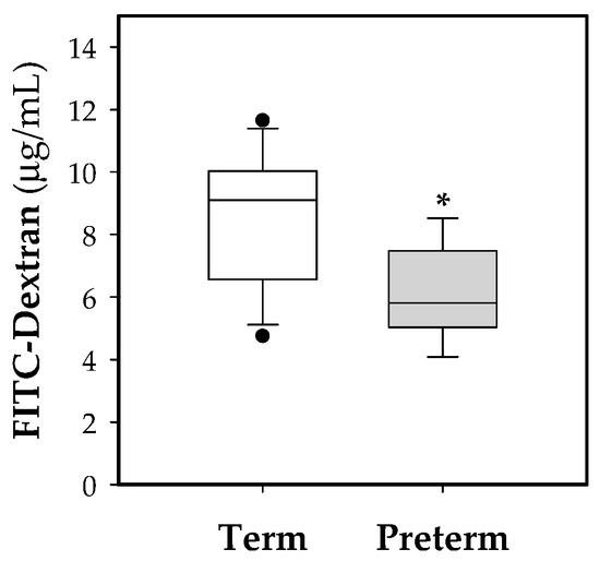 Box plot of intestinal permeability to 4 kDa-FITC-dextran in both experimental groups. Line indicates the median, box shows the interquartile range (IQR) and the whiskers are 1.5 × IQR (n = 10 pups per group). Statistical differences: * p < 0.05 vs. term group.