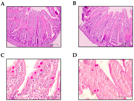 Fixed intestinal tissues were dehydrated by a growing gradient of ethanol, paraffin-embedded and cut into 5 μm sections using a microtome (RM2135, Leica, Wetzlar, Germany) at the CCiT-UB. Then, samples were mounted on Superfrost™ Ultra Plus slides (Thermo Fisher Scientific), as previously described [24]. The samples were deparaffinized and rehydrated by periodic acid-Schiff (PAS) staining. Briefly, intestinal tissues were stained in a 0.5% periodic acid (Sigma-Aldrich) solution for 5 min and washed in distilled water. Afterwards, sections were immersed in Schiff’s reagent (Sigma-Aldrich) for 7 min, washed in running tap water and counterstained with Mayer’s hematoxylin solution (Sigma-Aldrich) for 1 min and again washed in running tap water. Finally, the slides were mounted with coverslips using ProLongTM Gold Antifade Mountant (Life Technologies, Carlsbad, CA, USA). The observation of the intestinal architecture was accomplished using a bright-field microscope at 100X and 400X (Olympus BX41, Olympus Corporation, Shinjuku, Tokyo, Japan). All the morphometric measurements were processed with the Image J. software (Image Processing and Analysis in Java, National Institute of Mental Health, Bethesda, MD, USA). The morphometric analysis was focused on intestinal villi, 6−10 villi per animal and n = 5 animals/group were evaluated. Specifically, the villi height, width, area and epithelium perimeter of the villi were measured. The villi height was measured from the base of the villi (junction of the villi to crypts) to the top of the villi. Moreover, the villi width was calculated at the middle of the villi. The epithelial perimeter of the villi was evaluated by measuring the outer layer of the villi. Goblet cells are expressed as PAS-positive. The number of goblet cells per villi were counted manually and their area was also measured. Statistical analysis was performed with the average values of each animal.