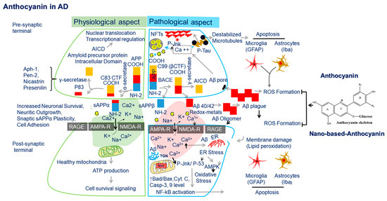 - Kim, M.J.; Rehman, S.U.; Amin, F.U.; Kim, M.O. Enhanced neuroprotection of anthocyanin-loaded PEG-gold nanoparticles against Abeta1-42-induced neuroinflammation and neurodegeneration via the NF-KB /JNK/GSK3beta signaling pathway. Nanomedicine 2017, 13, 2533–2544. [Google Scholar] [CrossRef]