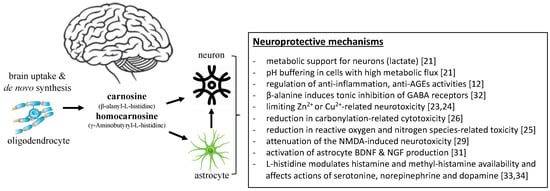 The presence of carnosine and its analogues in the brain suggests that these histidine-related compounds may play some physiological role in brain function, as endogenous antioxidants, neuromodulators, and neuroprotective molecules [12]. However, despite a number of studies demonstrating the anti-ischemic and neuroprotective properties of carnosine, there is currently no unified hypothesis as to the exact role of carnosine in brain disorders, or its potential use in preventing or managing these conditions. Although previous reviews including systematic reviews and meta-analyses on this topic have been conducted, these tend to focus on specific disorders such as neurodegenerative disorders [19] or depression [20], or are limited to human studies, overlooking the large body of evidence derived from experimental and animal models. Given these limitations and the considerable number of newly published studies, a comprehensive updated review of the evidence in relation to carnosine and brain-related disorders is pertinent.