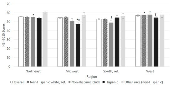 | Non-Hispanic white (reference) | 2.0 ± 0.1 | 2.6 ± 0.2 * | 2.5 ± 0.1 * | 2.5 ± 0.2 * |