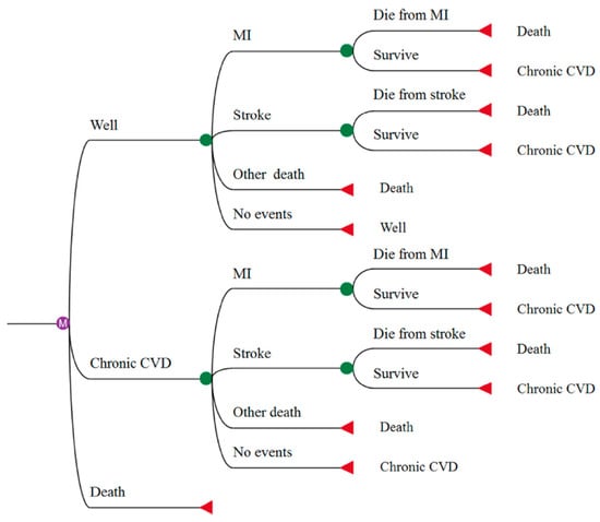 Decision tree representation of one branch of the Markov model structure for each arm. The model was based on the structure of Li []. The “well” and “chronic cardiovascular disease (CVD)” states are populated by individuals without and with prior myocardial infarction (MI) or stroke, respectively. The initial distribution of the population was set as follows: 3.83% of the individuals started in the “chronic CVD” state, and the remaining 96.17% started from the “well” state []. Individuals in the “well” state can remain in their state or progress to “chronic CVD” in the case of a first-ever MI or stroke. In each cycle, individuals in the “well” and the “chronic CVD” states may experience an MI or stroke and are characterized by the same survival probabilities as other individuals in their state, regardless of their medical history. “Other death” accounts for all individuals who die of causes that differ from CVDs.