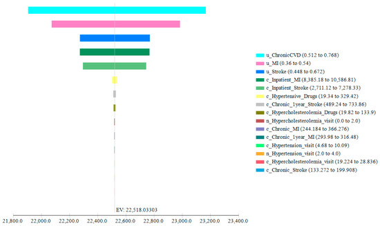 We performed deterministic and probabilistic sensitivity analyses to evaluate the impact of uncertainty on the base case estimates. In the deterministic sensitivity analysis (tornado diagram, Figure 2), we applied the appropriate ranges where available (Table 3) and ±20% variations to all the other inputs. The utilities of suffering from chronic CVD, of having a stroke or an MI, and the cost of being hospitalized after those events had the largest impact on the final outcome.