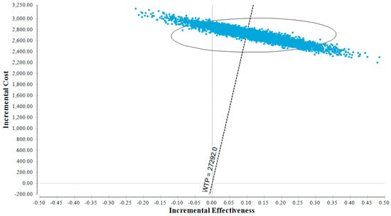 Monte Carlo simulation. Dots represent the values of the incremental cost-effectiveness ratio in 5000 simulations carried out to consider the uncertainty input parameters. The ellipse represents 95% of all data points. The line passing through the intersection of the axes represents the willingness to pay (WTP), corresponding to the gross domestic product per capita; 58.3% of the dots are located in the northeast quadrant on the right of the WTP line, that is, due to stochastic and parametric uncertainty, we expect the fortified milk powder to be a cost-effective intervention in 58.3% of the cases.