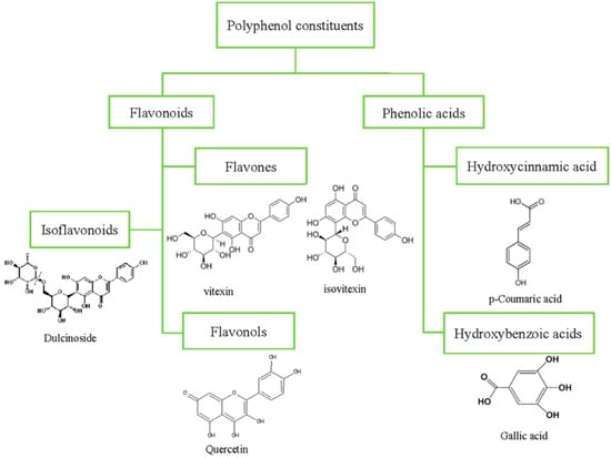 The mung bean is rich in polyphenolics. The major phenolic constituents in the mung bean are phenolic acids (1.81–5.97 mg rutin equivalent/g), flavonoids (1.49–1.78 mg catechin equivalent/g), and tannins (1.00–5.75 mg/g) [,,,]. The chemical structures of the main polyphenol constituents in the mung bean are shown in Figure 1. Both the cotyledons and seed coats of mung beans contain phenolics, but most are concentrated in the seed coats. In addition, the composition and content of bioactive compounds in the mung bean depend on many factors, e.g., their cultivars, the color of their seed coats, the climatic and agronomic conditions of their growth, and the extraction and analytical methods []. The polyphenol composition and content in the mung bean are shown in Table 1.