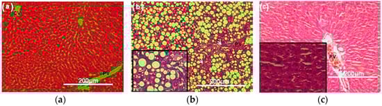 Liver histopathological changes in different experimental animals. (a) Normal group, (b) rats supplemented with a methionine-choline deficient diet, (c) rats receiving the germinated mung bean (1000 mg/kg body weight, for 4 weeks) and supplemented with a methionine-choline deficient diet. Scale bar, 200 μm; White arrow: Fibrosis. Central vein (CV); portal vein (PV) [].