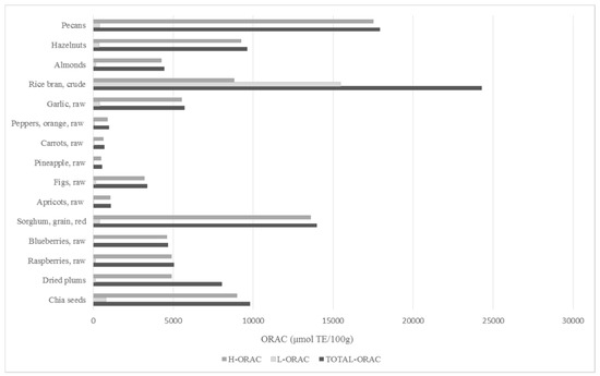Figure 3. ORAC values for antioxidant activity of selected foods [60,61]. ORAC, Oxygen Radical Absorbance Capacity; H-ORAC, hydrophilic ORAC value for water soluble antioxidants; L-ORAC, lipophilic ORAC value for lipid soluble antioxidants; TE, Trolox equivalents; compilation of results.