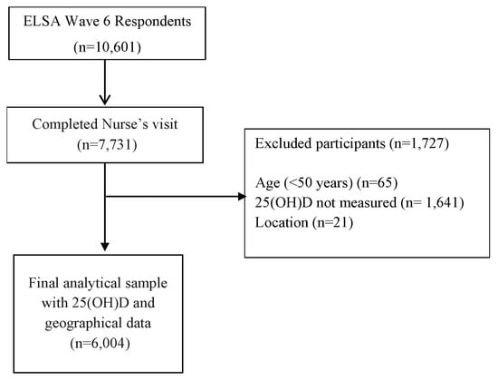 The current study includes participants from the English Longitudinal Study of Ageing (ELSA), which is an ongoing nationally representative study of health. ELSA consists of men and women born on or after the 29 February 1952. The Health Survey of England recruited participants using multistage stratified probability sampling with postcode sectors selected initially and household addresses thereafter. The ELSA study sample was selected from the Health Survey for England (HSE) sample in 1998, 1999, and 2001, and a biennial follow-up is ongoing since. Further details of ELSA have been reported previously [22]. For the present analysis, cross-sectional data from wave 6 were used (2012–2013), as this was the first time 25(OH)D concentrations were collected for the new ELSA study sample. A total of 10,601 subjects were interviewed at wave 6. For the present analysis, participants were included if they were aged ≥50 years old, identified as a resident in England, and had a measured concentration of 25(OH)D; the latter required a blood sample to be collected during the nurse visit stage. After excluding those who did not complete the core and nurses’ data collection at wave 6, or had missing data for other key variables, the final analytical sample was comprised of 6004 subjects (Figure 1). Participants excluded due to age (<50 years (n = 65)) were typically Partners of the core members, and due to location (n = 21) were resident outside of England, typically Scotland and Wales.