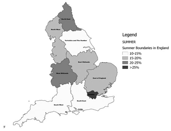 The prevalence of vitamin D deficiency (Institute of Medicine (IOM) <30 nmol/L) in English regions during the Summer period.