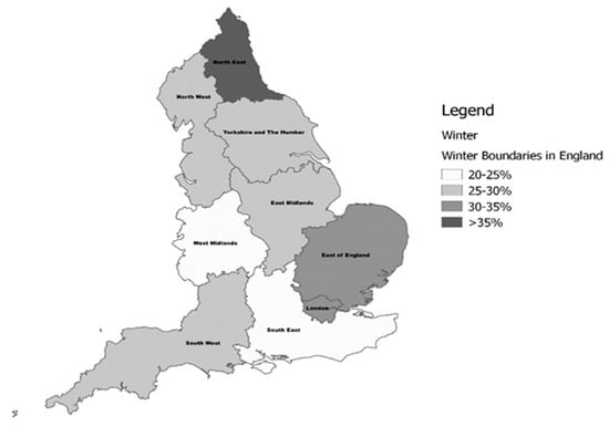 The prevalence of vitamin D deficiency (IOM <30 nmol/L) in English regions during the Winter period.