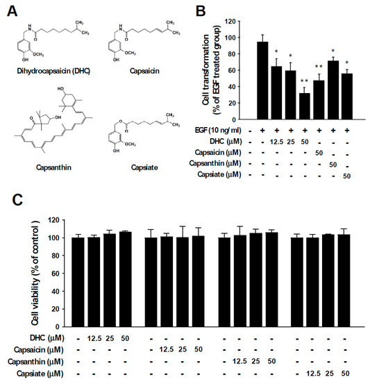 Epidermal growth factor (EGF) stimulates cell growth and abnormal EGF signaling is known to promote malignant transformation, cancer progression, and metastasis [25,26]. EGF functions as a ligand to activate the EGF receptor (EGFR) and dysregulation of EGF and/or EGFR is known to cause various types of human cancers [27,28,29]. To examine the chemopreventive potential of chili pepper components (Figure 1A), we investigated their inhibitory activities against neoplastic cell transformation induced by EGF stimulation. Anchorage-independent growth in agar was examined after chili pepper compounds and EGF were treated to JB6 P+ cells. The number of colonies formed in the agar was measured. Among the tested compounds, dihydrocapsaicin (DHC) exhibited the strongest protective effect against EGF-induced neoplastic cell transformation (Figure 1B). At identical concentrations, capsaicin, capsanthin, and capsiate reduced cell transformation by 50%, 25%, and 41%, respectively (Figure 1B). DHC also suppressed 12-O-tetradecanoylphorbol 13-acetate (TPA)-induced cell transformation (Figure S1). In addition, DHC treatment led to a reduction in 2D colony formation in a dose-dependent manner (Figure S2). The chili pepper components DHC, capsaicin, capsanthin, and capsiate did not show significant cytotoxicity (Figure 1C). These results suggest that dihydrocapsaicin can act as a potent inhibitor of neoplastic cell transformation.
