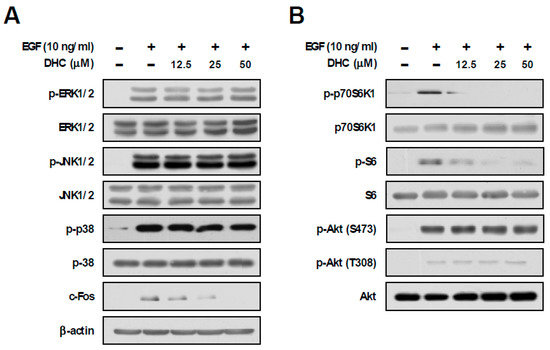 In order to understand the underlying molecular mechanism for the chemopreventive effect of DHC, we examined the downstream signaling pathways mediated by EGF. The MAPKs and mTOR signaling pathways have been reported to play crucial roles in EGF-mediated cancer development [30]. Treatment with DHC did not cause any noticeable effects against EGF-induced phosphorylations of ERK, JNK, and p38, whereas c-Fos expression was downregulated in a dose-dependent manner (Figure 2A). Additionally, DHC decreased EGF-induced phosphorylations of p70S6K1 and S6, while not affecting the phosphorylation of Akt (Figure 2B). When activated, mTORC1 phosphorylates p70S6K1, whereas mTORC2 phosphorylates Akt (S473) [11]. Therefore, DHC appears to selectively suppress the mTORC1 signaling pathway.