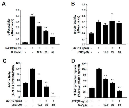 AP-1 transcription factors are dimeric proteins composed of the Fos and Jun families [12]. The activity of AP-1 controls key aspects of carcinogenesis, including cell proliferation, differentiation, survival, and neoplastic transformation [12]. c-Fos functions as a potent oncogenic protein by participating as a major member of AP-1 during cancer development [12,13]. Treatment with DHC suppressed c-Fos activity (Figure 3A), which was in line with the reduced protein expression (Figure 2A). In contrast, DHC treatment did not affect the activity of c-Jun, suggesting that DHC specifically targets c-Fos (Figure 3B). More importantly, DHC treatment completely blocked EGF-induced AP-1 activity (Figure 3C). Next, we assessed the effect of DHC on COX-2 promoter activity. COX-2 is an important inflammatory mediator of cell transformation that is transcriptionally controlled by AP-1 [31]. EGF-induced COX-2 promoter activity was attenuated by DHC (Figure 3D). These results indicate that DHC blocks AP-1 via c-Fos downregulation which may, subsequently, lead to the inhibition of COX-2 and neoplastic transformation.