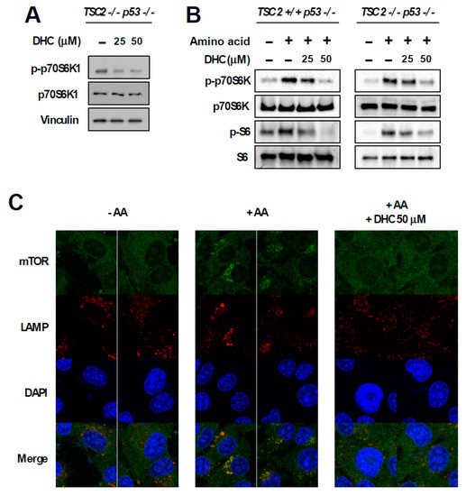 In order to dissect the molecular mechanism responsible for DHC-mediated inhibition of phospho-p70S6K1, we utilized TSC2 knock-out (KO) MEFs. The TSC1-TSC2 complex is a key negative regulator of mTORC1. As the TSC1-TSC2 complex transfers majority of the upstream signaling pathways controlling mTORC1 activity [10], we questioned whether DHC modulates mTORC1 activity via the TSC complex. Interestingly, DHC suppressed the phosphorylation of p70S6K1 in TSC2 KO MEFs, suggesting that the DHC inhibits mTORC1 signaling in a TSC-independent manner (Figure 4A). In addition, we conducted in vitro kinase assays on p70S6K1, PKBα, PKBβ, and SGK using DHC and found that DHC does not target these kinases, implying that reduction in phosphorylation of p70S6K1 by DHC is not a result of directly suppressing the activity of these kinases (Figure S3). TSC KO MEFs display a hyperactive-mTORC1 phenotype in a TSC complex-independent manner, which provides a useful environment to study the relationship between amino acid and mTORC1 activity [32]. The activation of mTORC1 requires several necessary conditions, and input from sufficient amino acid levels is known to play a critical role in mTORC1 signal transduction [11]. Hence, we next examined whether DHC affects amino acid-mediated mTORC1 activation. Cells were starved from all amino acids and re-stimulated to investigate the effect of DHC on amino acid signaling. Pre-treatment with DHC was able to inhibit the amino acid-induced phosphorylation of p70S6K1 and S6 in both TSC WT and KO MEFs (Figure 4B), suggesting that DHC targets the amino acid-mediated mTORC1 activation pathway. To further confirm this phenomenon, we analyzed mTOR translocation. The presence of amino acid is not only a necessary condition for mTORC1 activation, but also an inducer of mTORC1 translocation to the lysosome [33]. While amino acid-starved cells exhibited a dispersed pattern of mTOR, the addition of amino acid induced the mTOR translocation to the lysosome (Figure 4C). Pre-treatment with DHC prevented the amino acid-mediated mTOR translocation, demonstrating that DHC can block amino acid signals leading to mTORC1 activation (Figure 4C). Previous reports demonstrated that hyperactive mTORC1 cells are sensitive to amino acid starvation [34]. Thus, we questioned whether DHC can promote cell death in cells with high mTORC1 activity. In consistence with previous studies, TSC2 WT MEFs (low-mTORC1) were relatively resistant to amino acid deprivation, whereas TSC2 KO MEFs (high-mTORC1) were sensitive to the removal of amino acids (Figure 4D). Strikingly, the addition of DHC was able to selectively promote cell death in TSC2 KO MEFs (high-mTORC1) with reduced amino acid levels, while showing little cytotoxicity towards TSC2 WT MEFs (low-mTORC1) (Figure 4D). These results show that in addition to repressing amino acid signaling, DHC can also augment cell death mediated by amino acid deprivation in mTORC1-hyerpactive cells.