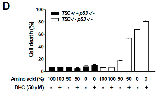 Effect of dihydrocapsaicin on amino acid signaling. (A) TSC2−/−, p53−/− MEFs were treated as indicated for 30 min and lysed for immunoblot analysis. Media was changed to a serum-free media when dihydrocapsiain was added. (B) TSC2+/+, p53−/− MEFs were incubated with amino acid-deprived and dialyzed-FBS containing media for 5 h to provide amino acid starvation. Dihydrocapsaicin was pre-treated for 1 h and cells were subsequently re-stimulated with amino acid, using media containing amino acid and regular FBS for 1 h. TSC2−/−, p53−/− MEFs were serum starved overnight and then incubated with amino acid-deprived and serum-free media for 5 h. Dihydrocapsaicin was pre-treated for 1 h and cells were subsequently re-stimulated with amino acid, using serum-free media containing amino acid for 1 h. (C) Immunofluorescence was performed to examine the translocation of mTOR in TSC2−/−, p53−/− MEFs. Mechanistic targets of rapamycin (mTOR) is shown in green and the lysosomal marker, lysosomal-associated membrane protein 1 (LAMP1) is shown in red. DAPI (4′,6-diamidino-2-phenylindole) is shown in blue. (D) 24 h after seeding, media was changed to regular growth media, or media with reduced amino acid content as indicated. Cell death was measured 48 h after changing the media.