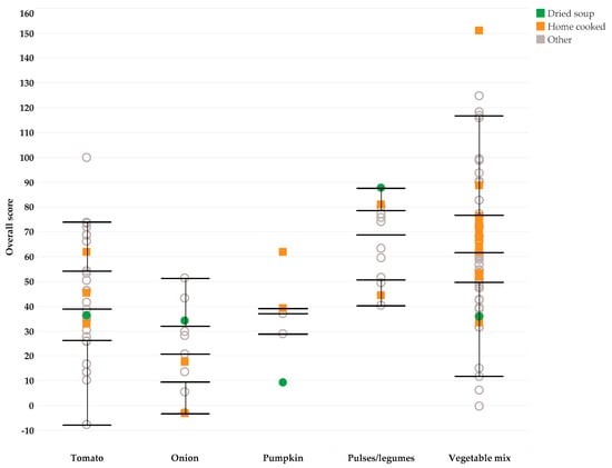 Nutrient density scores of dry vegetable soups with home-made and other soups.