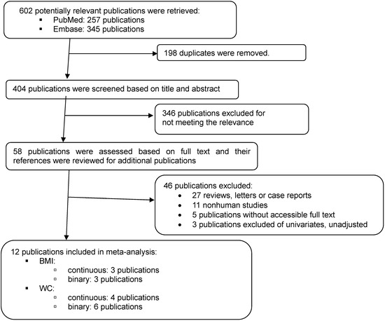 To be included under the scope of this paper, studies had to be an observational study (e.g., cross-sectional, case-control, and cohort studies) or experimental study (e.g., randomized controlled trials) that examined the relationship between coffee intake and adiposity as indicated by weight, BMI, or WC. Studies that tested the effect of coffee extract supplements were excluded. We also excluded studies that reported results only from univariable analyses because estimates from these studies are highly likely to be confounded by factors such as age, alcohol intake, and smoking. Because obesity patterns in men and women generally differ, with men being more prone to abdominal adiposity (“apple shape”) and women more prone to lower-body adiposity (“pear shape”), coffee intake, if plays a role in inducing obesity, may exert differential effects by sex. For this reason, we primarily extracted separate estimates by sex unless studies provided only a pooled estimate. The flow diagram of the study selection is presented in Figure 1.