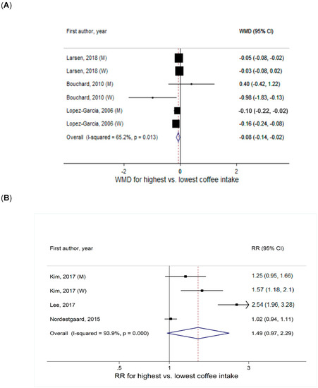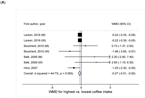 Based on four studies [8,10,11,15], the summary WMD in WC comparing the highest vs. lowest categories of coffee intake was −0.27 (95% CI = −0.51, −0.02), with moderate heterogeneity (I2 = 45%) (Figure 3A). There was no evidence of small study effects, such as publication bias (PEgger = 0.98). Within each sex, an inverse association was suggested, but it was statistically significant only in men (WMD = −0.21, 95% CI = −0.35, −0.08, I2 = 0%) (Table 1). Heterogeneity by sex was not statistically significant (Pheterogeneity = 0.58).