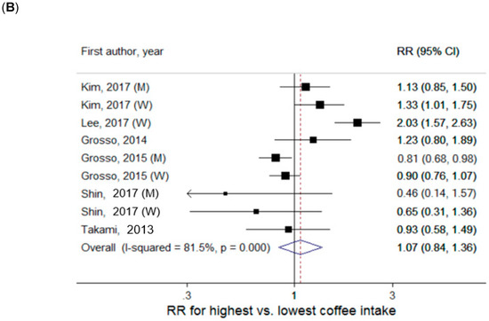 A total of three studies were included [6,7,13], of which two Asian studies [6,13] analyzed overweight and obesity as a single category. The summary RR of overweight or obesity comparing the highest vs. lowest categories of coffee intake was 1.49 (95% CI = 0.97, 2.29). There was very high heterogeneity (I2 = 94%) (Figure 2B), with studies conducted in South Korea [6,13] showing variable but strong positive associations (summary RR = 1.71, 95% CI = 1.12, 2.61, I2 = 86%). Small study effects, such as publication bias, were not indicated (PEgger = 0.19). In subgroup analysis by sex, the association was not significantly heterogeneous (Pheterogeneity = 0.13), but a significant positive association was pronounced in women (summary RR = 2.01, 95% CI = 1.25, 3.21, I2 = 83%) than in men (summary RR = 1.25, 95% CI = 0.95, 1.65, I2 = not relevant) (Table 1).