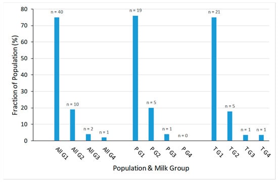 Distribution of milk groups in the different populations: All = all participants, P = participants with preterm infants, T = participants with term infants, G1 = milk group 1, G2 = milk group 2, G3 = milk group 3, G4 = milk group 4.