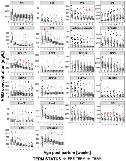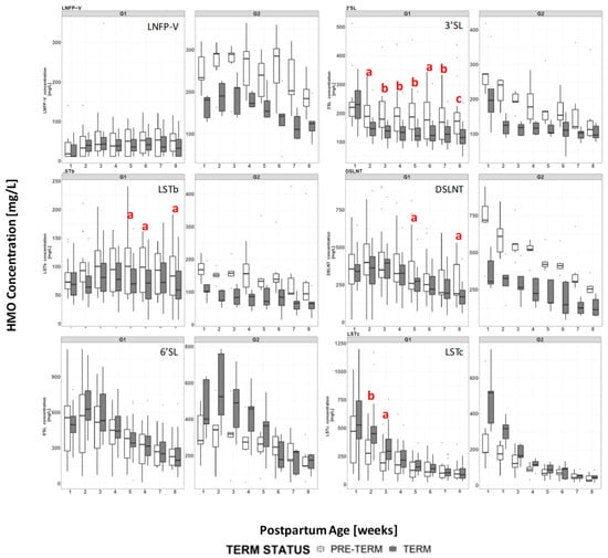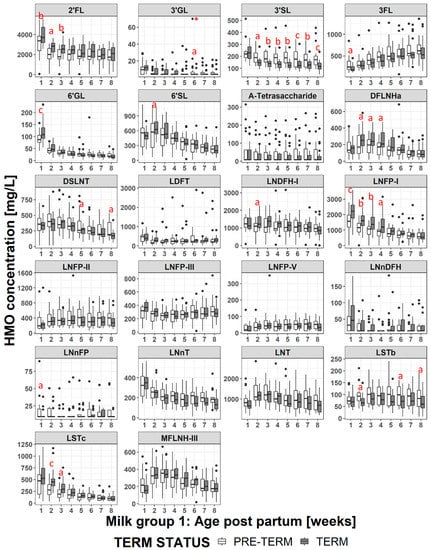 Considering all samples, when the children were the same age postpartum, the concentration of each HMO in the mother’s milk was generally comparable between term and preterm groups (Figure 3 and Supplementary Table S1). The main exceptions to this were 3′SL, LSTb and DSLNT all of which were at significantly higher concentrations in the preterm milk at postpartum weeks 2 to 8. The concentrations of LSTc (at weeks 1 to 4) and 6′SL (at weeks 2 to 4) were higher in term milk during the first month, but were not significantly different at later time points.